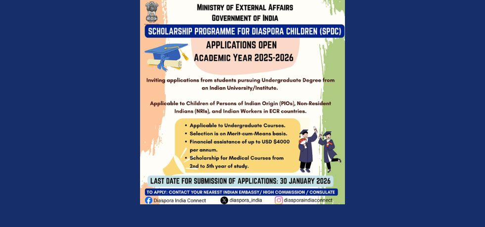 cons.ouag@mea.gov.in or click the link." alt="Announcement of Scholarship Programme for Diaspora Children (SPDC) for AY 2025–26. For details, please contact